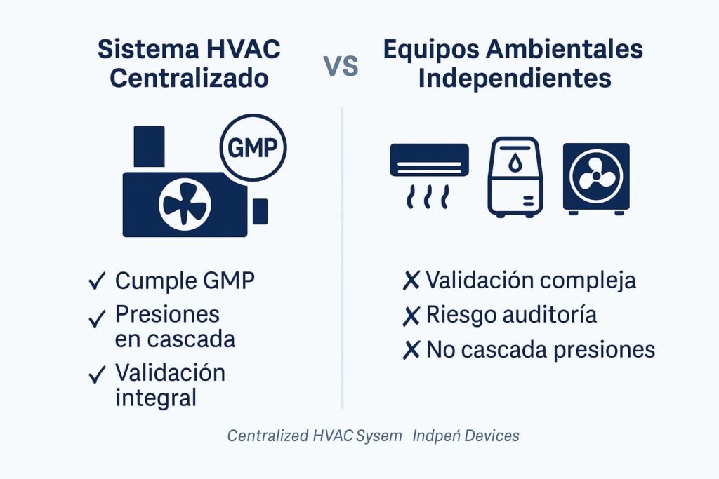 1. Validar cada aparato por separado es una pesadilla documental. Cada split, cada deshumidificador, cada equipo necesitaría su IQ/OQ/PQ, sus mantenimientos, sus alarmas y su integración en la estrategia de control de contaminación.