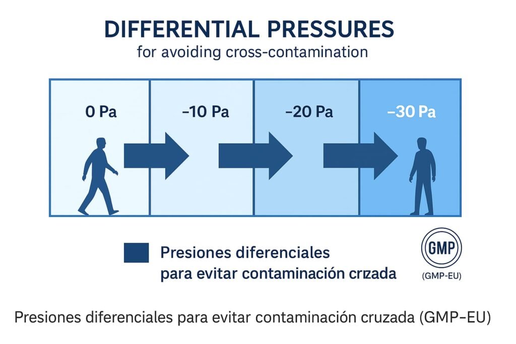 2. El gradiente de presiones no se puede garantizar con equipos aislados. El sistema GMP exige que las salas tengan diferencias de presión controladas (cascadas) para evitar flujos de aire no deseados y contaminación cruzada.